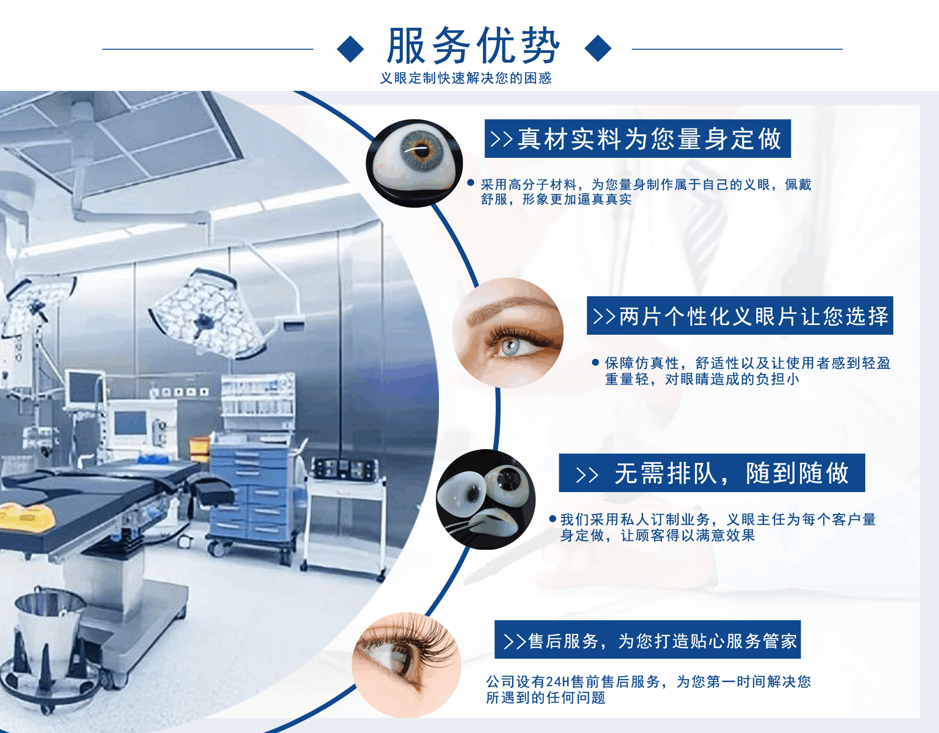 正目醫(yī)療科技有限公司致力于為用戶提供假眼,在哪里可以定制義眼,義眼哪家好,假眼價格,義眼價格,義眼費(fèi)用,義眼公司,是集義眼定制、保養(yǎng)、咨詢?yōu)橐惑w的綜合性義眼定制企業(yè)?! —?dú)創(chuàng)的義眼工藝結(jié)構(gòu),根據(jù)仿生物學(xué)原理,采用進(jìn)口醫(yī)用植入材料:高分子材料、無毒素、性能穩(wěn)定、堅固耐用)、聚甲基丙乙烯阝-羥乙酯HEMA材料(軟性親水性材料),結(jié)合獨(dú)特的義眼個性化佩戴技術(shù),按佩戴者健眼的形態(tài)、角膜、虹膜、及瞳孔的大小、色澤、血管紋理和脂肪分布,設(shè)計制作。擁有超薄、質(zhì)輕、光滑、親水透氧、佩戴舒適和高逼真的特點(diǎn)。為保證佩戴效...